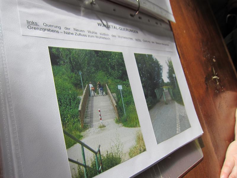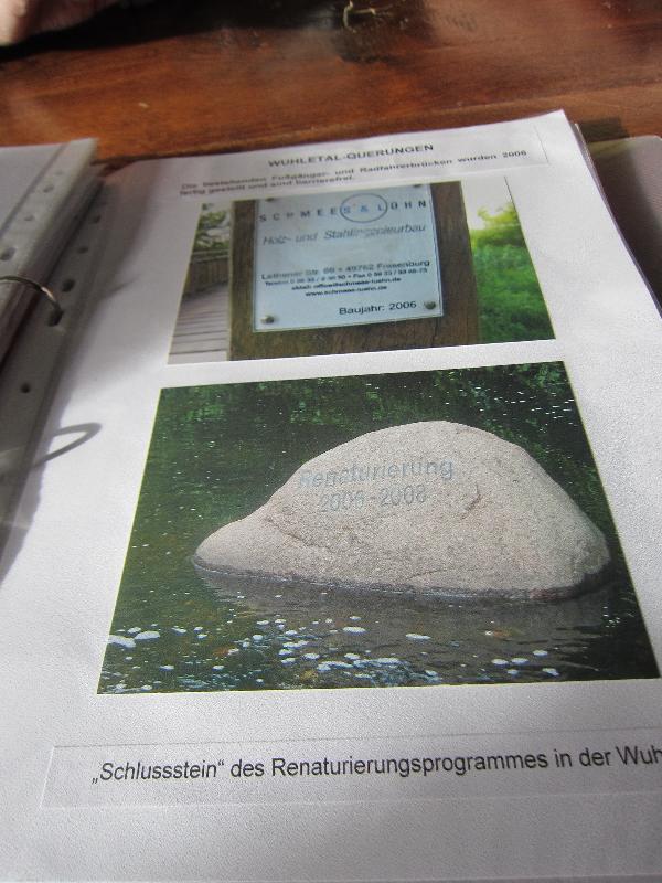 Wuhletal-Querungen Oberes Bild: Die bestehenden Fußgänger- und Radfahrerbrücken wurden 2006 fertiggestellt und sind barrierefrei. Erstellt wurden die Brücken von der Firma Schmees & Lühn (S & L), Holz- und Stahlingenieurbau, Lathener Straße 69, 49762 Fresenburg... Baujahr 2006 Unteres Bild: Renaturierungsstein in der Wuhle: Renaturierung 2006 - 2008 [unter tatkräftiger Mitwirkung der Anwohner, die dort ihr Herzblut haben hineinfließen lassen] "Schlussstein" des Renaturierungsprogramms in der Wuhle |