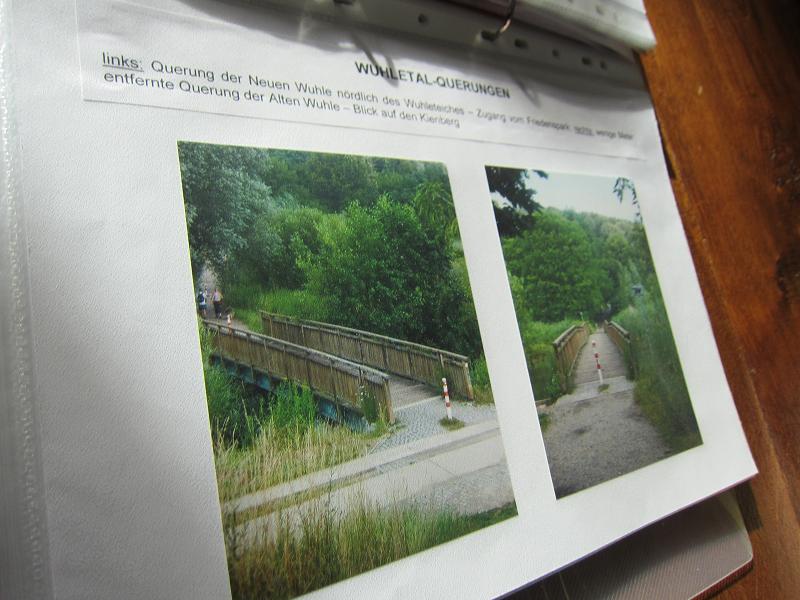 Wuhletal-Querungen Linkes Bild: Querung der Neuen Wuhle nördlich des Wuhleteiches - Zugang vom Jelena-Santic-Friedenspark (sogenannte Entenbrücke) Rechtes Bild: Wenige Meter entfernte Querung der Alten Wuhle - Blick auf den Kienberg |