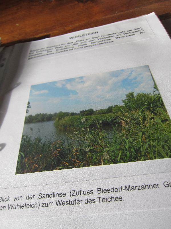 Wuhleteich Geplanter Standort für den "Platz am See" (vormals "Café am See"). Ein befestigter Platz am Ufer soll zum Verweilen am Wuhleteich einladen. Die Errichtung eines temporären Bauwerkes für gastronomische Zwecke ist nicht ausgeschlossen. Blick von der Sandlinse (Zufluss Biesdorf-Marzahner-Grenzgraben in den Wuhleteich) zum Westufer des Teiches. |