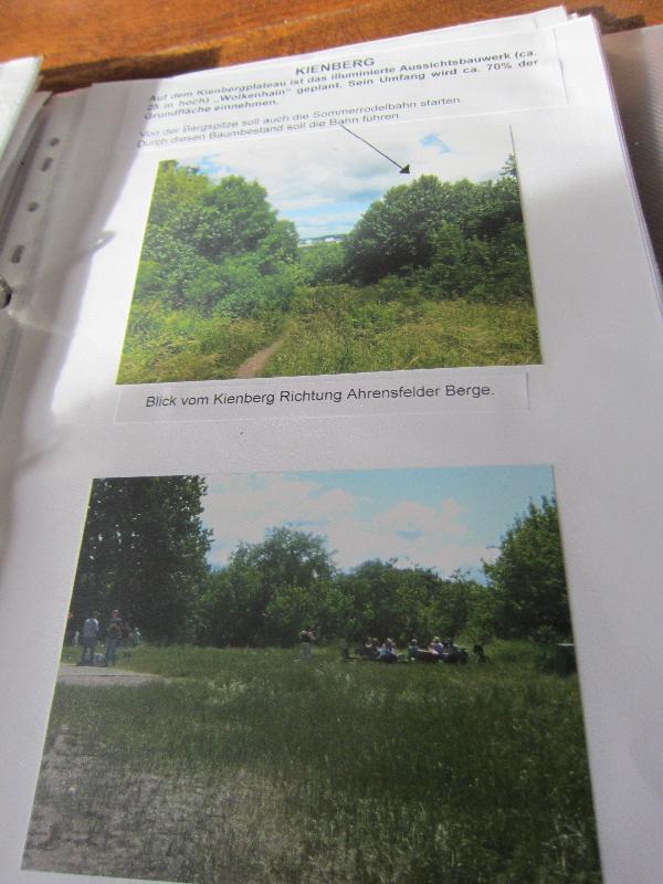 Kienberg Oberes Bild: Auf dem Kienberg-Plateau ist das illuminierte Aussichtsbauwerk (circa 25 Meter hoch) "Wolkenhain" geplant. Seine Grundfläche wird circa 70 Prozent der Plateau-Fläche einnehmen. Von der Bergspitze soll auch die Sommerrodelbahn starten. Durch diesen Baumbestand soll die Bahn führen (s. Pfeil). Blick vom Kienberg Richtung Ahrensfelder Berge Unteres Bild: Das Kienberg-Plateau ist ein beliebter Treffpunkt nicht nur für Jugendliche. Hier oben gibt es auch wiesenbestandene Grillplätze, die zum Grillen und Chillen einladen. |