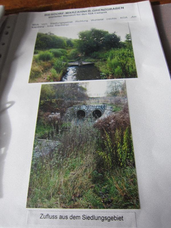Biesdorf-Marzahner-Grenzgraben - geplanter Standort für den IGA-Campus Oberes Bild: Blick vom Siedlungsgebiet Richtung Wuhletal (rechts: KGA "Am Kienberg", links: Kienberg) Unteres Bild: Zufluss aus dem Siedlungsgebiet |