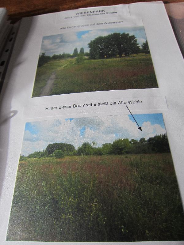 Blick von der Eisenacher Strasse Oberes Bild: Alte Eichengruppe auf dem Wiesenpark Unteres Bild: Hinter dieser Baumreihe fließt die Alte Wuhle (s. Pfeil) |
