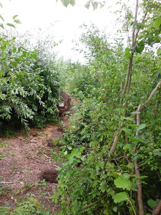 Planungen am Biesdorf-Marzahner-Grenzgraben (BMG) [Die massiven Baumfällungen werden in den Planungen vornehm als "Zurücknahme des Waldbestandes" bezeichnet. Die Waldvernichtung samt Begleitflora mit Wildrosen, Holunder und Wildkräuterbestand hat zur Folge, dass die Wurzeln der Bäume am Rand in der etwa 10 bis 15 Zentimeter hohen Humusschicht, die sich inzwischen auf der Mülldeponie gebildet hat, nicht ausreichend Halt finden und es verstärkt zu Windwurf kommt. Wie glaubwürdig ist Umweltbildung unter den Vorzeichen der Vernichtung der bis dato vorhandenen artenreichen Natur, die einen Beitrag der hochgepriesenen, aber mit Füßen getretenen Biologischen Vielfalt leistet? - Naturschutzverbände, wo seid ihr???!!!] |