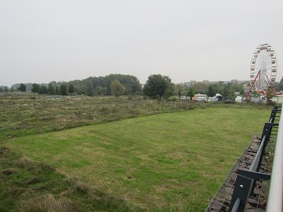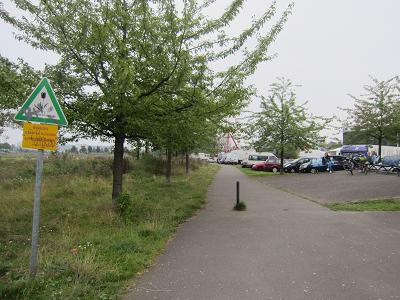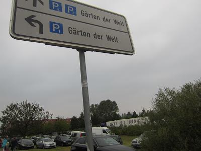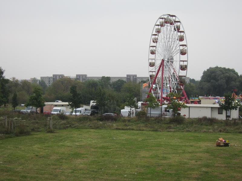 Der Wiesenpark gegenüber dem Haupteingang der Gärten der Welt Eisenacher Straße zum Rummel umfunktioniert mit LKW-Parkplatz |