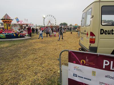 dahinter LKW- und PKW-Parkpätze und Rummel,