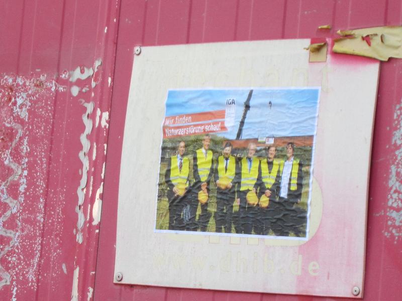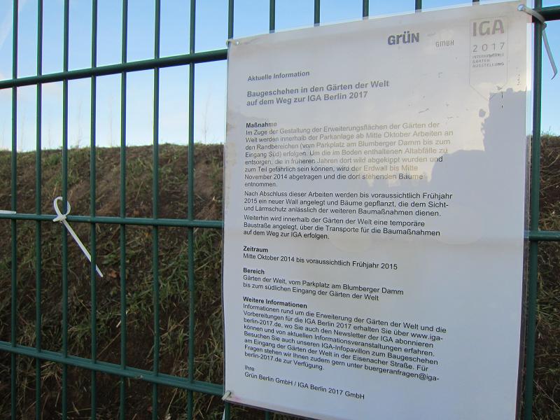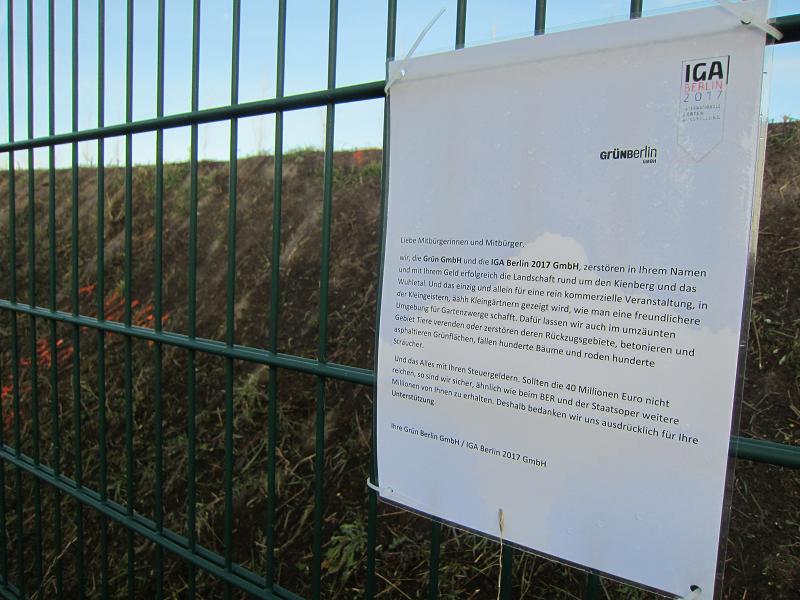 Am Sichtwall, der Sie jetzt daran hindert, eine Mondlandschaft statt der Gärten der Welt unbezahlt zu sehen, und später daran, die Bezahlausstellung zu betrachten, begegnet mir ein Schreiben des Ausstellers IGA Berlin 2017 GmbH, deren Mutterorganisation die Grün Berlin GmbH ist. Beim Lesen des Textes vermute ich eine Satire: Liebe Mitbürgerinnen und Mitbürger, wir, die Grün GmbH und die IGA Berlin 2017 GmbH, zerstören in Ihrem Namen und mit Ihrem Geld erfolgreich die Landschaft rund um den Kienberg und das Wuhletal. Und das einzig und allein für eine rein kommerzielle Veranstaltung, in den Kleingeistern, äähh Kleingärtnern gezeigt wird, wie man eine freundlichere Umgebung für Gartenzwerge schafft. Dafür lassen wir auch im umzäunten Gebiet Tiere verenden oder zerstören deren Rückzugsgebiete, betonieren und asphaltieren Grünflächen, fällen hunderte Bäume und roden hunderte Sträucher. |