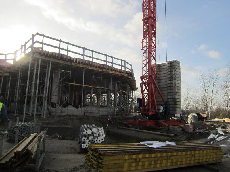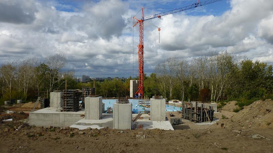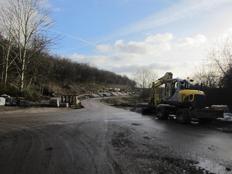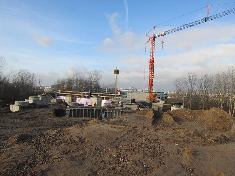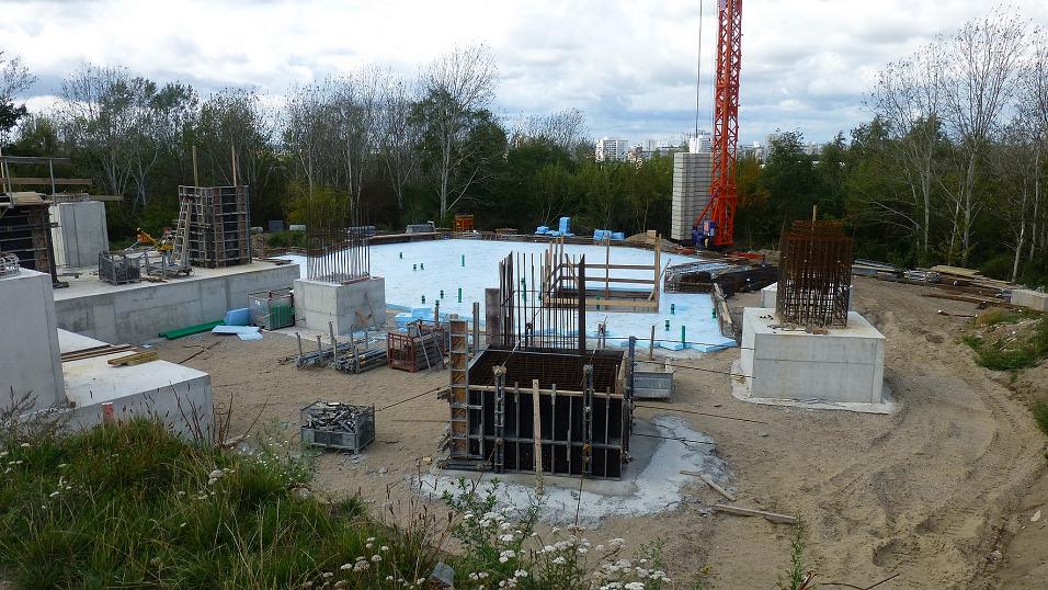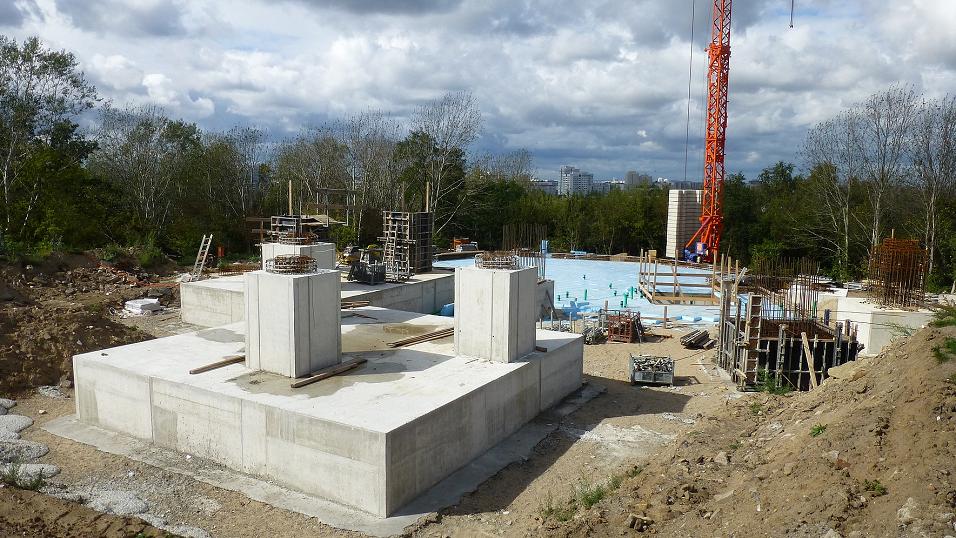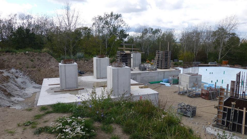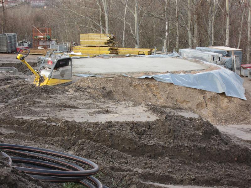 Der Wolkenhain, das Beton-, Stahl- und Plastikgebäude, im Entstehen. Wir sehen nur noch die oberen Zipfel der Betonmassen, die hier versenkt wurden, s. oben. Man spricht von 1000 Tonnen Beton, die hier für die Gartenschau-Naturpräsentation einbezogen werden. |