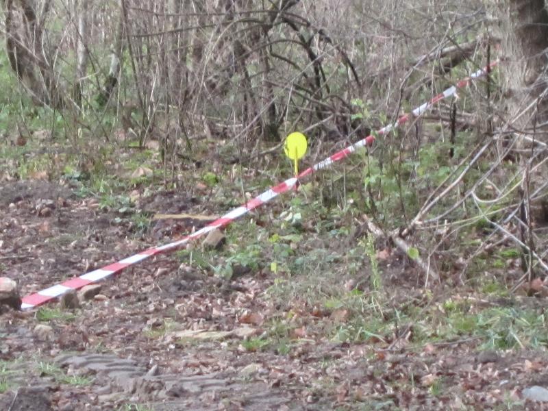 Das rot-weiße Flatterband, das den Verlauf der Seilbahn markiert, zieht sich quer durch den Kienberg-Wald. |