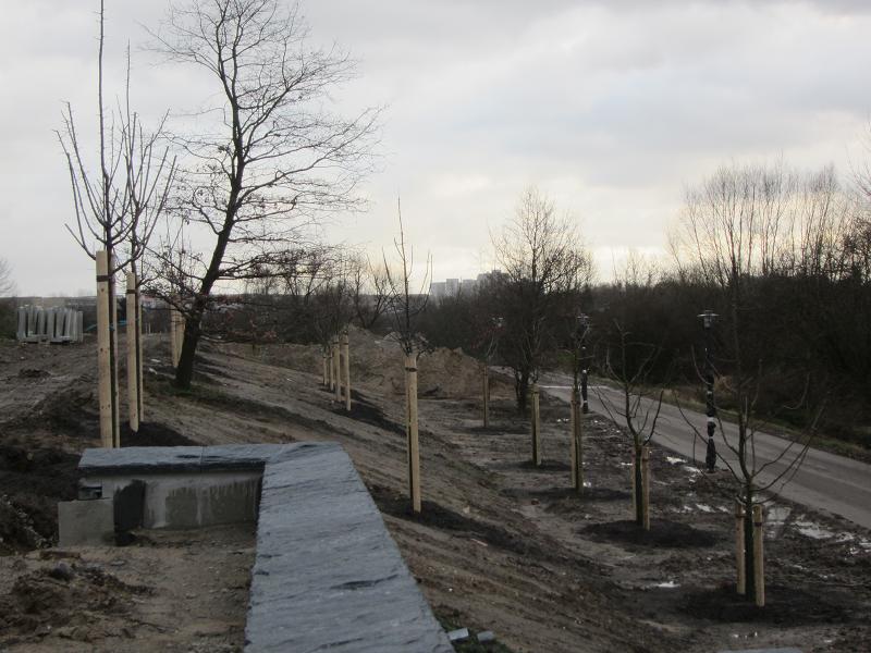 Kienbergterrassen mit neu angelegter "Streuobstwiese". Diese besteht hier aus einer Obstbaumreihen neben dem Weg entlang dem Biesdorf-Marzahner-Grenzgraben. So bekommt meine Vorstellung von Streuobstwiese einen ganz neuen Aspekt. Ich hielt dies eher für eine Obstbaumplantage, das sich mit einer Wiese aus Wildblumen paart. Einen mit Obstbäumen gesäumten Weg würde ich nicht als Streuobstwiese bezeichnen. Aber hier wird ja viel für das Naturverständnis der geneigten Besucher getan. |