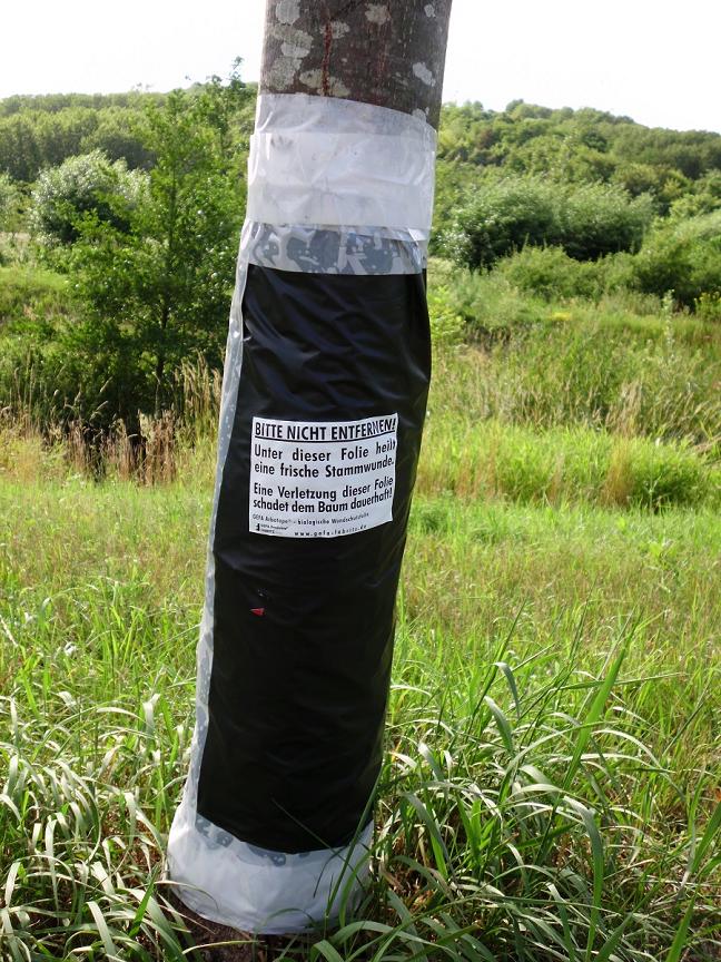 Ein schwer geschädigter Baum wurde verarztet. Sein sehr hoher Stammverband informiert: BITTE NICHT ENTFERNEN! Unter dieser Folie heilt eine frische Stammwunde. Eine Verletzung dieser Folie schadet dem Baum dauerhaft! GEFA Arbotope - biologische Wundschutzfolie / www.gefa-fabritz.de |