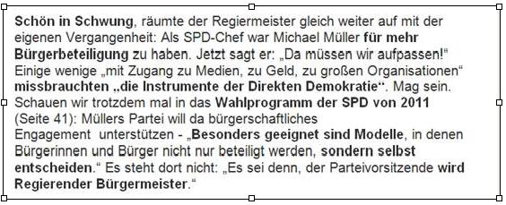 Bürgerbeteiligung stellen wir Bürger uns anders vor, nämlich als Mitgestaltung, beruhend auf der Berliner Verfassung gemäß Artikel 3 (1): Die gesetzgebende Gewalt wird durch Volksabstimmungen, Volksentscheide und durch die Volksvertretung ausgeübt, die vollziehende Gewalt durch die Regierung und die Verwaltung sowie in den Bezirken im Wege von Bürgerentscheiden.