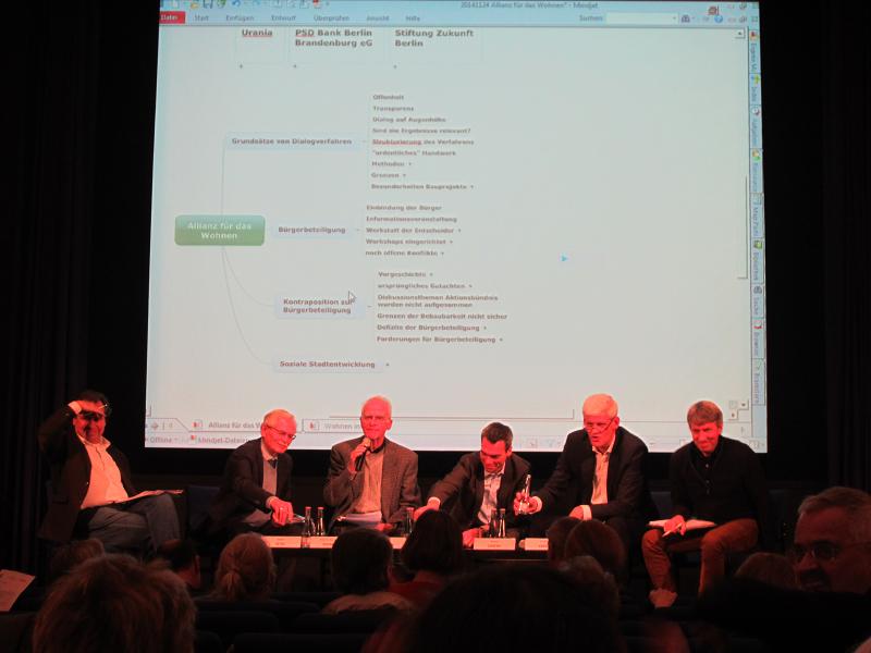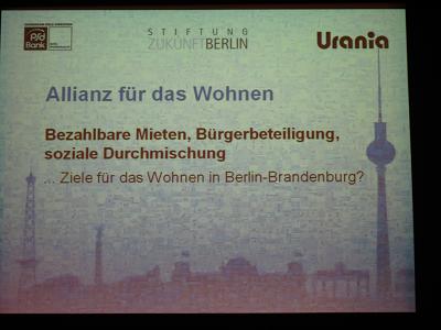 Am Montag, dem 24. November 2014, hat in der Urania, An der Urania 17, 10787 Schöneberg, Tel.: 218 90 91 eine Veranstaltung zum Thema Bezahlbare Mieten, Bürgerbeteiligung, soziale Durchmischung und Ziele für das Wohnen in Berlin-Brandenburg stattgefunden.