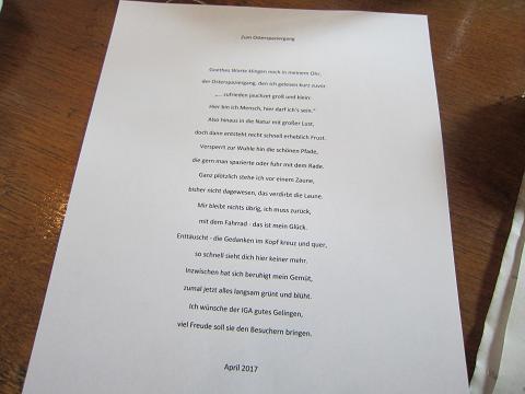 ![]() der Osterspaziergang, den ich gelesen kurz zuvor. "... zufrieden jauchzet groß und klein: Hier bin ich Mensch, hier darf ich's sein." Also hinaus in die Natur mit großer Lust, doch dann entsteht recht schnell erheblich Frust. Versperrt zur Wuhle hin die schönen Pfade, die gern man spazierte oder fuhr mit dem Rade. Ganz plötzlich stehe ich vor einem Zaune, bisher nicht dagewesen, das verdirbt die Laune. Mir bleibt nichts übrig, ich muss zurück, mit dem Fahrrad - das ist mein Glück. Enttäuscht - die Gedanken im Kopf kreuz und quer, so schnell sieht dich hier keiner mehr. Inzwischen hat sich beruhigt mein gemüt, zumal jetzt alles langsam grünt und blüht. Ich wünsche der IGA gutes Gelingen, viel Freude soll sie den Besuchern bringen. April 2017. N.N. |