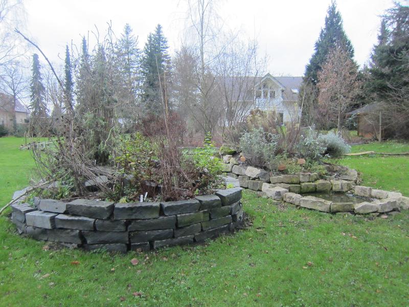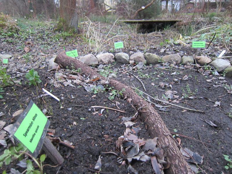 Beeteinfassung mit Totholz und Feldsteinen / Beschriftungstafeln für alle Stauden, u.a. einer ganzen Sammlung verschiedener Minze-Arten |