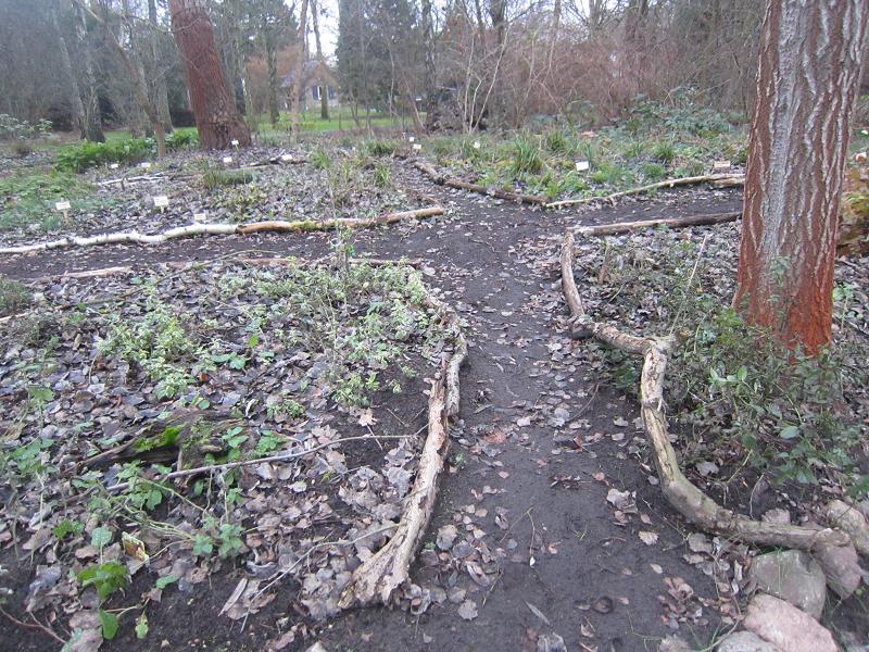 Beeteinrahmung mit Totholz und Pflanzenschilder |