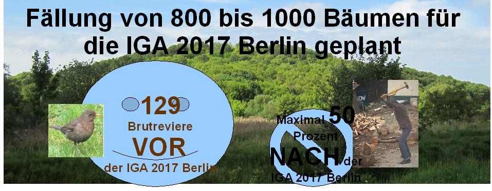 Wo finden diese im Jahre 2013 gezählten 129 Brutpaare zukünftig ihre Reviere, wenn der Wald radikal abgeholzt wird? Wieviel Lebensraum bleibt nach der mit Brachialgewalt von heute auf morgen gefällten 800 bis 1000 Bäume den am Boden in dichtem Unterholz brütende Arten wie Zaunkönig, Rotkehlchen und Gartengrasmücke oder den in dichtem Gebüsch wie Amseln und Finken oder dem hoch in den Baumkronen wie Pirol und Mäusebussard oder den in Höhlen brütenden Vögeln wie der Buntspecht? Das wird uns durch die IGA 2017 Berlin GmbH als "behutsamer" Waldumbau und "Waldentwicklungskonzept" verkauft.